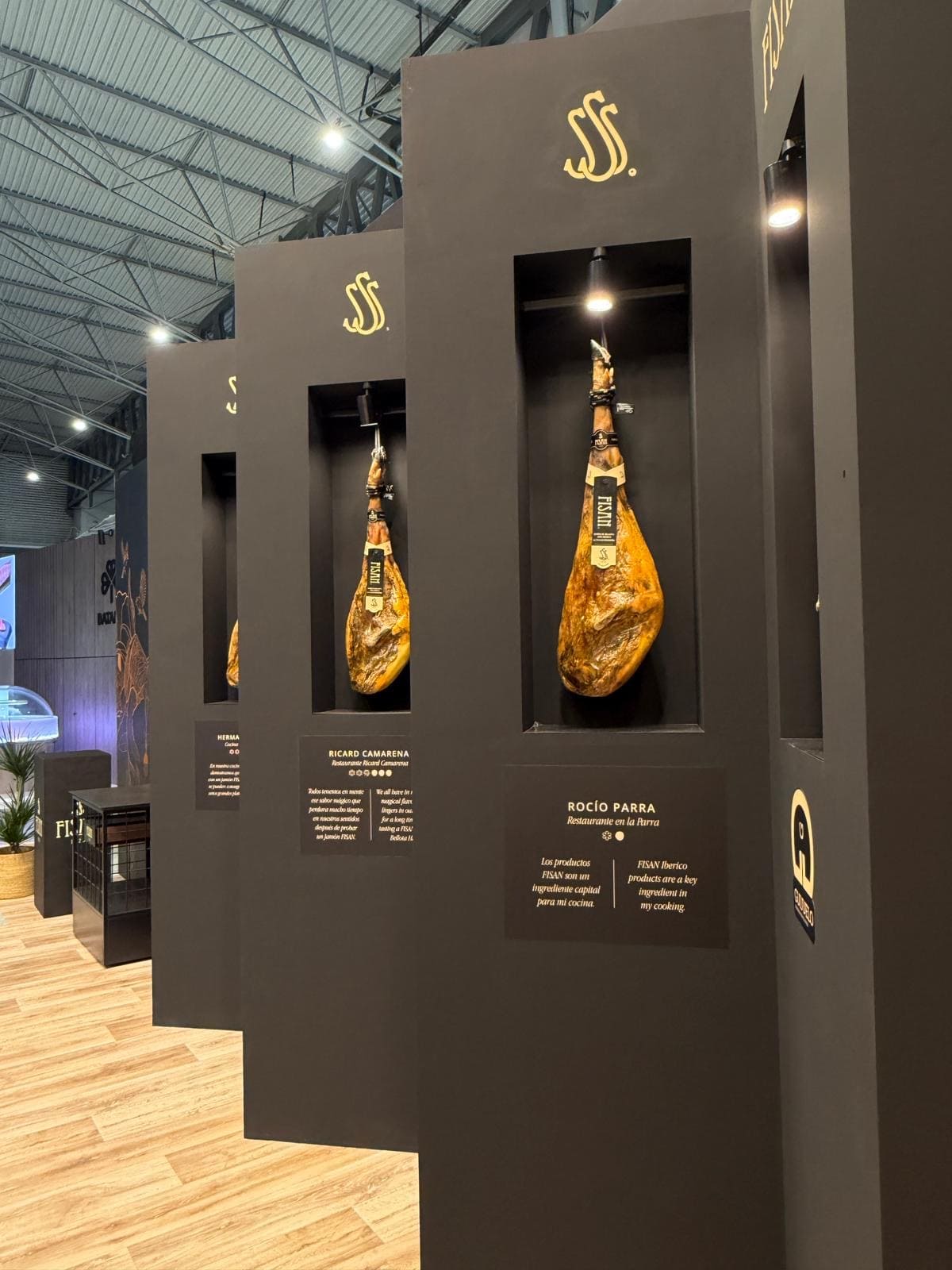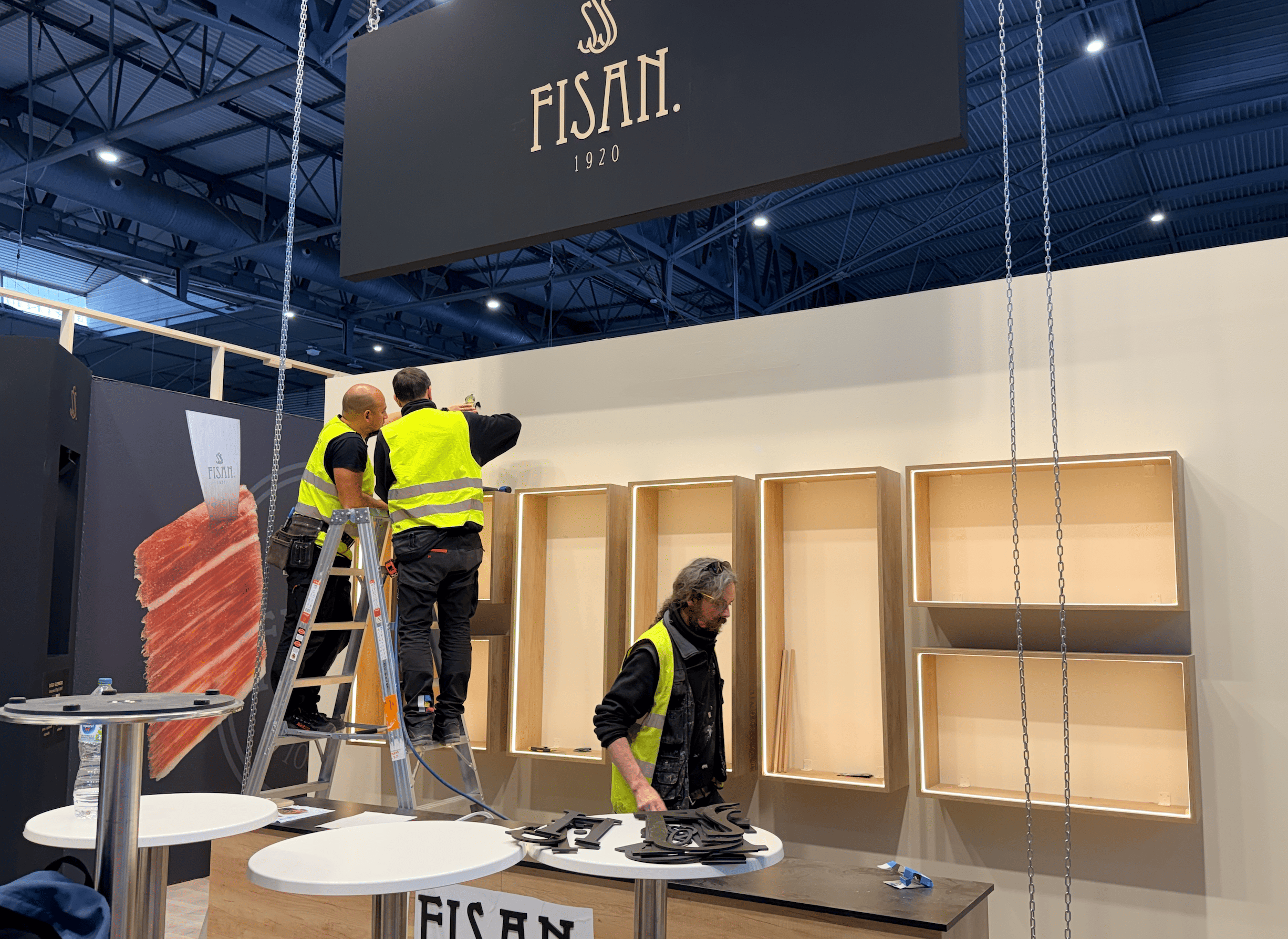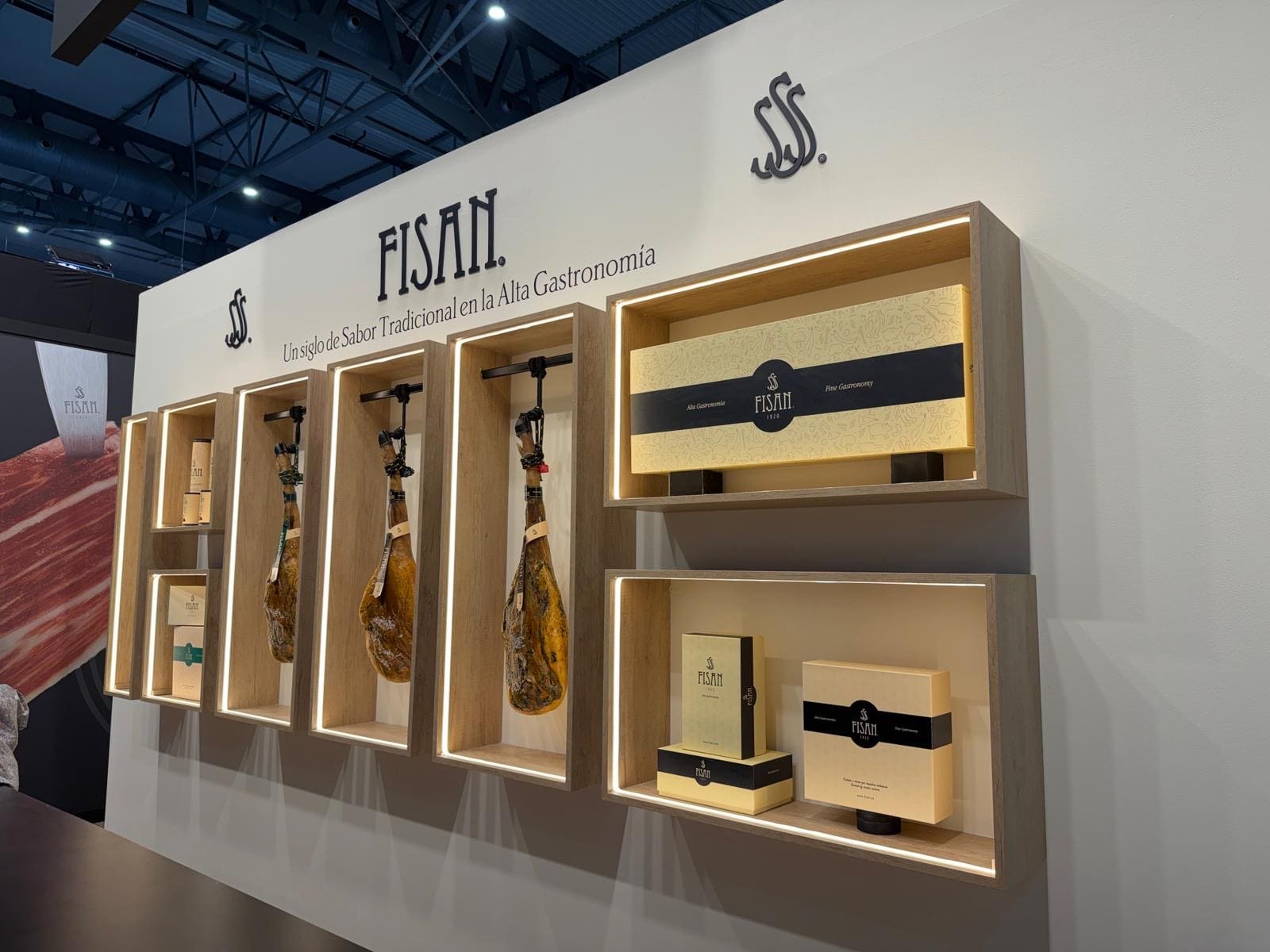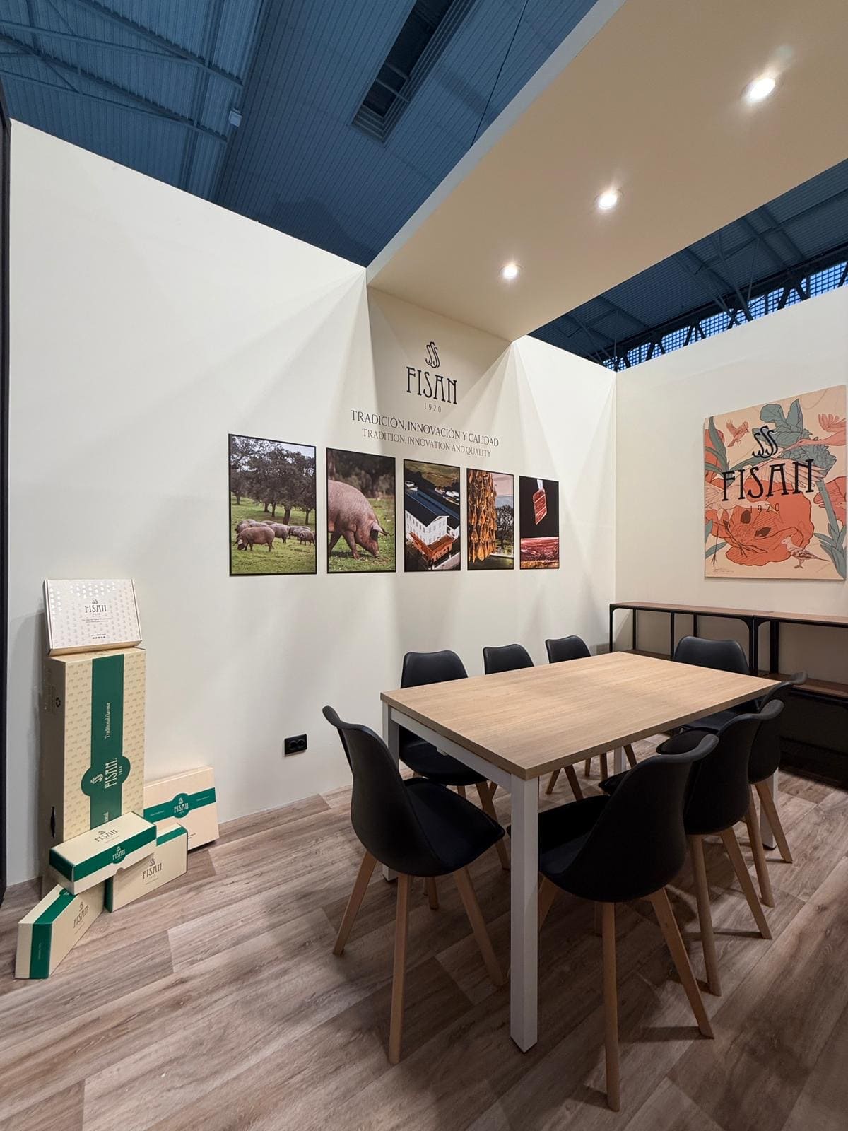 La instalación se ejecutó de forma precisa y coordinada en el recinto ferial, integrando iluminación técnica, rotulación corporativa y zonas funcionales como área de reuniones y exposición de producto. El montaje permitió destacar las piezas protagonistas —los jamones— mediante una presentación cuidada y estratégica.