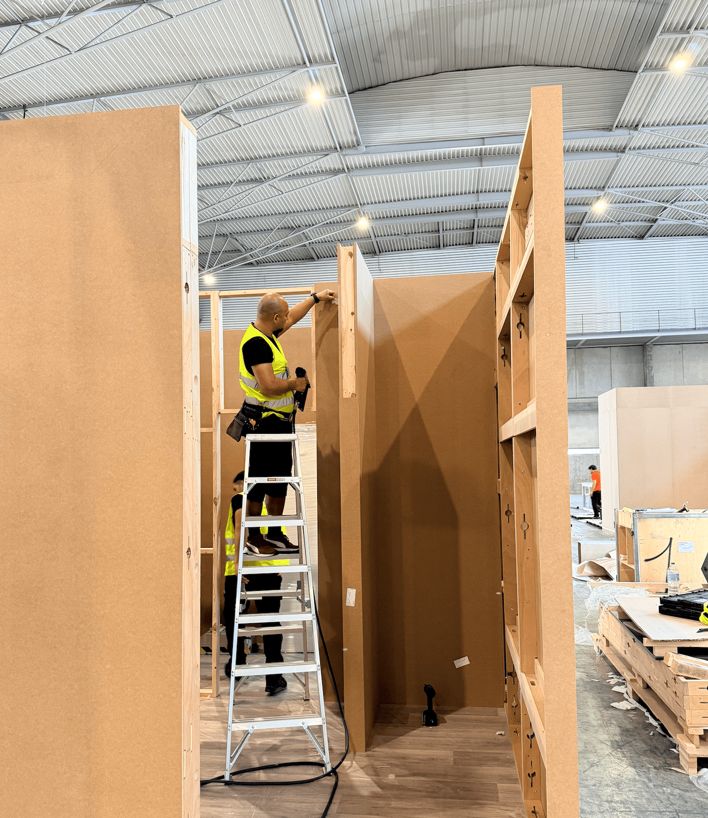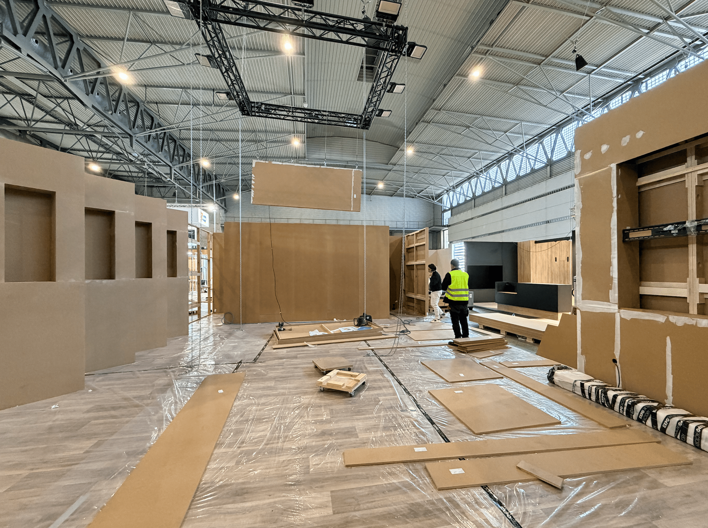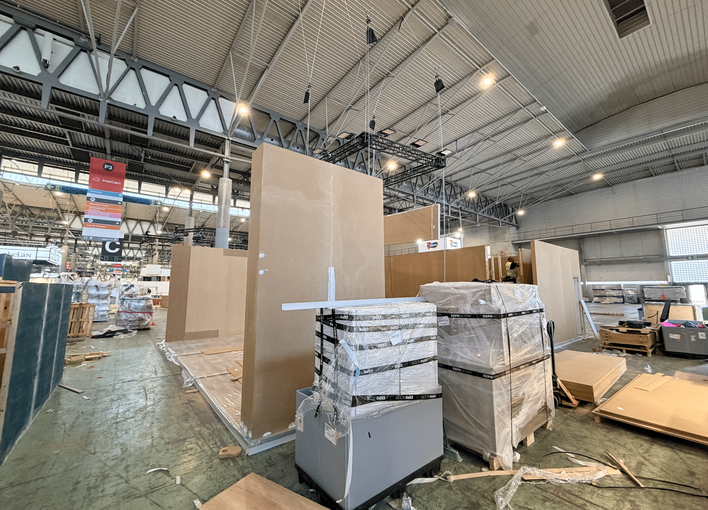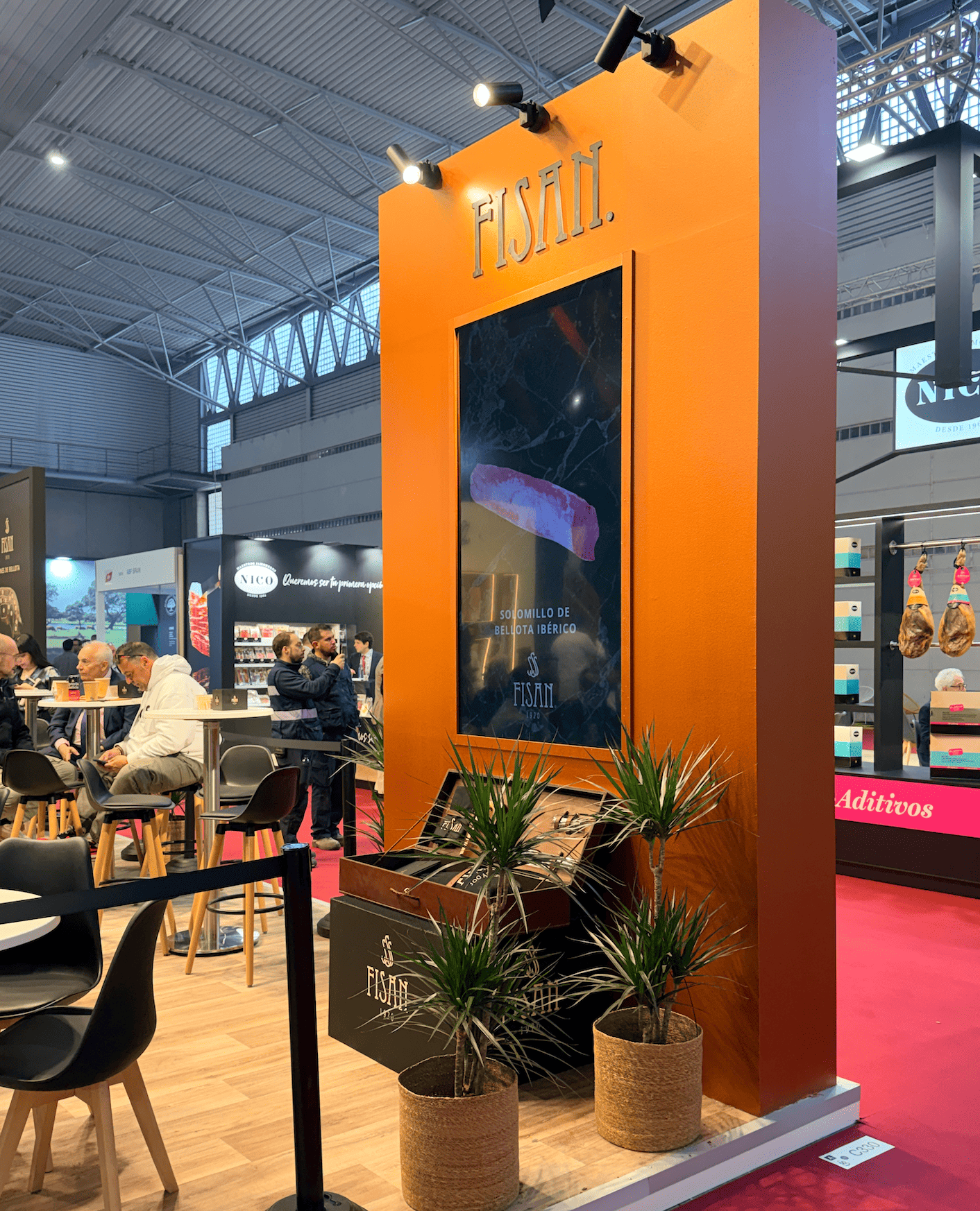La instalación se ejecutó de forma precisa y coordinada en el recinto ferial, integrando iluminación técnica, rotulación corporativa y zonas funcionales como área de reuniones y exposición de producto. El montaje permitió destacar las piezas protagonistas —los jamones— mediante una presentación cuidada y estratégica.